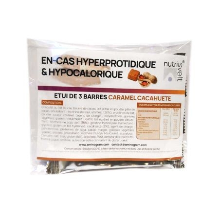 Les barres hyperprotéinées Nutrisvelt sont des en-cas hyperprotidiques et hypocaloriques appauvris en glucides en lipides. Avec ses 33% de protéines, la barre Nutrisvelt permet de maintenir votre capital musculaire. Et comme elle est pauvre en calories, elle peut s'inscrire dans un objectif d'amincissement. Son bon goût de caramel et de cacahuètes en fait un délicieux en-cas qui apaise les gourmands. Pour varier les plaisirs, découvrez aussi les barres goût fruits rouges. Les barres protéinées Nutrisvelt conviennent pour l'entretien musculaire, pour l'amincissement mais aussi pour la pratique d'un sport, pour les enfants en période de croissance et pour les seniors. Idéal en période de sèche, cet encas hyperprotéiné peut s'accompagner d'un brûle-graisse naturel en gélule.